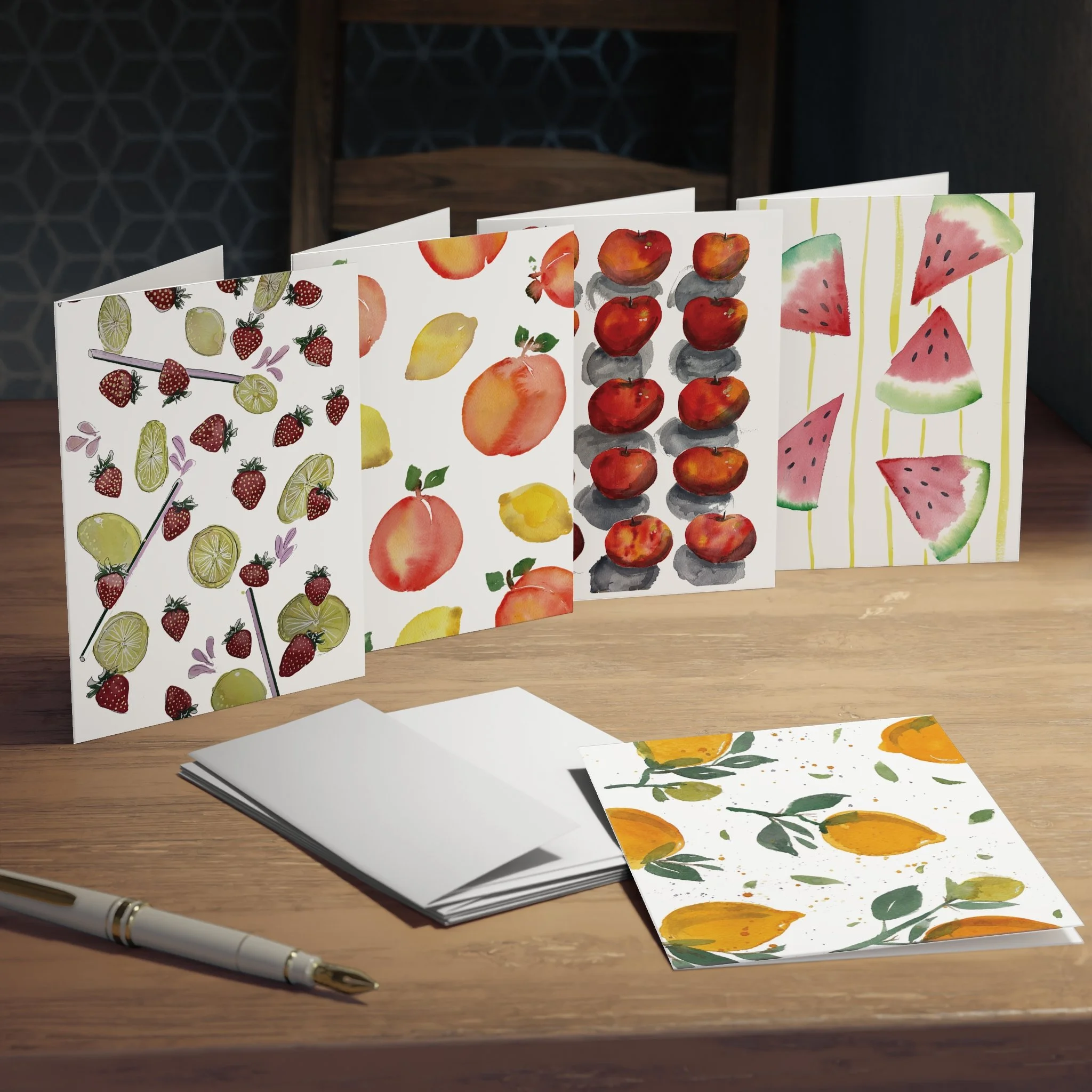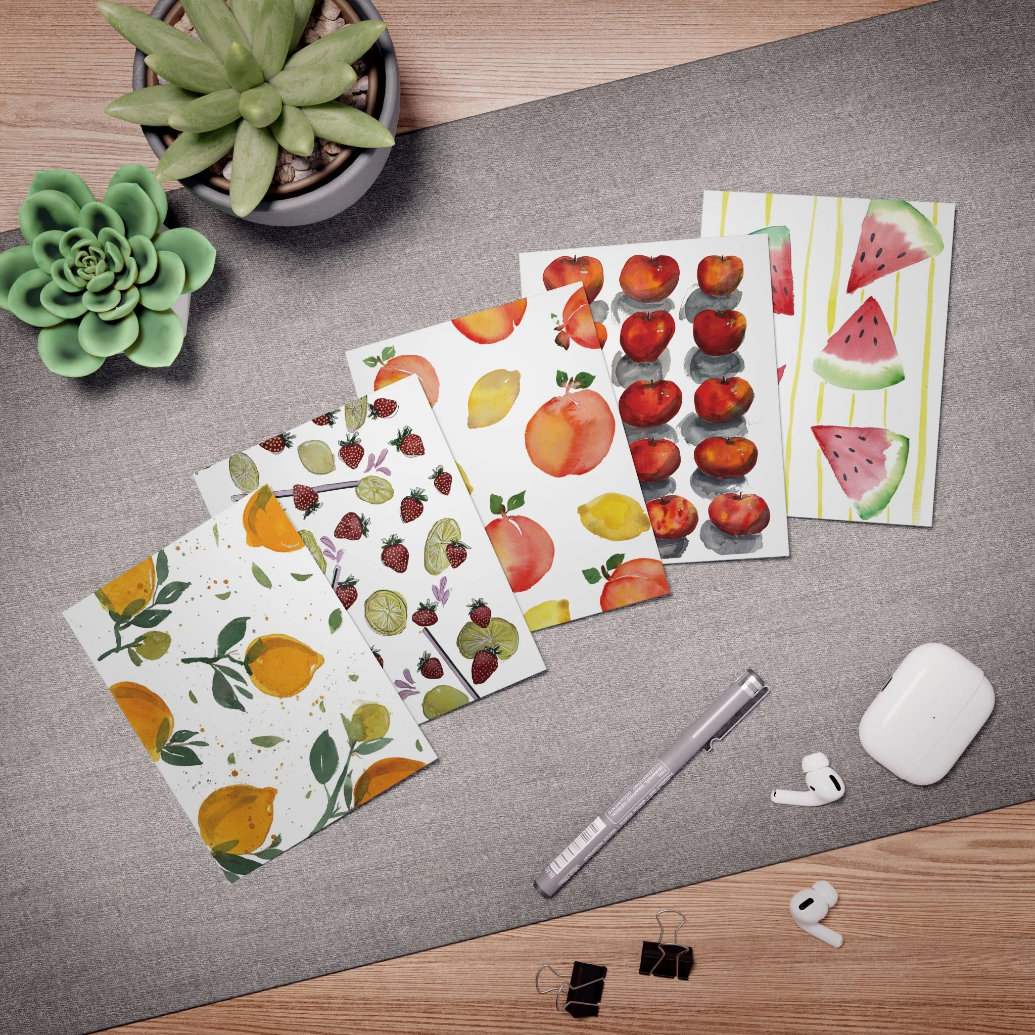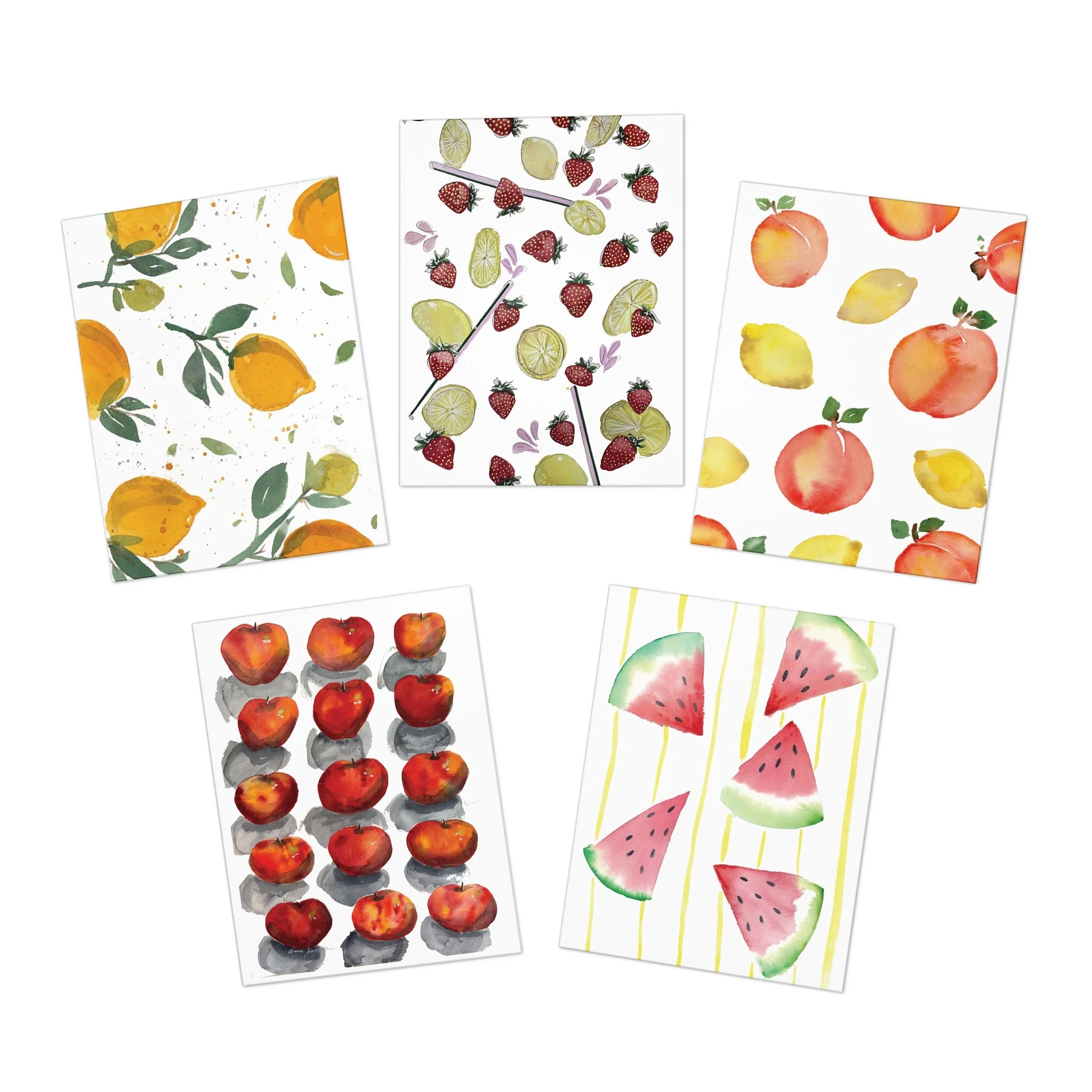 An assorted collection of my fruit greeting cards. Send a cheery note to a loved one or friend. Vibrant colors. Comes with matching envelopes. Printed on high-quality uncoated paper. Size: 4.25 x 5.5