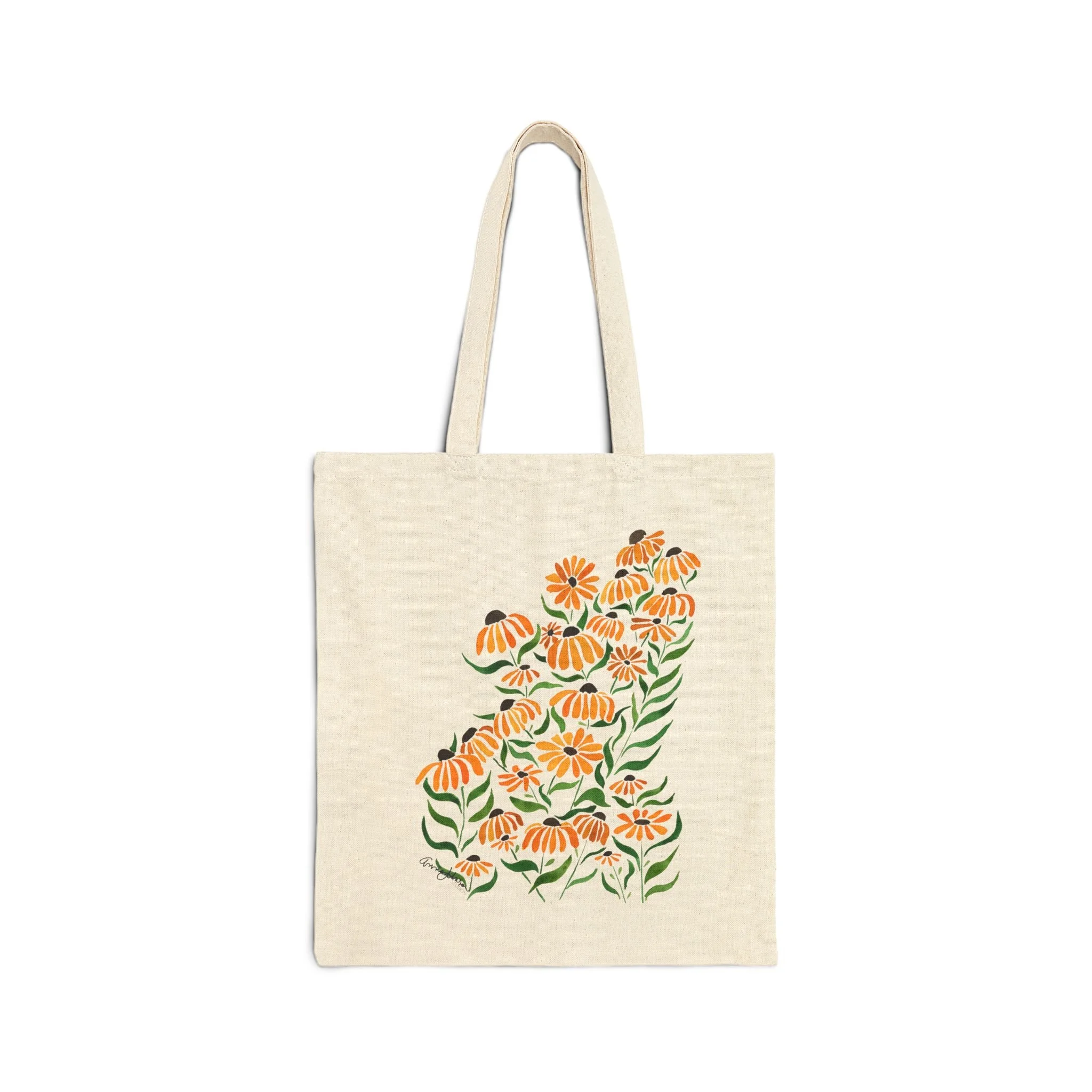 This double-sided Black-eyed Susan tote bag is 100% cotton bag, 15" x 16". It's perfect for everyday. While the canvas material showcases this original artwork in vibrant colors, it's also durable and will last for years. The bag features 20" handles (made from the same canvas), making it easy to carry even with a week's worth of shopping.