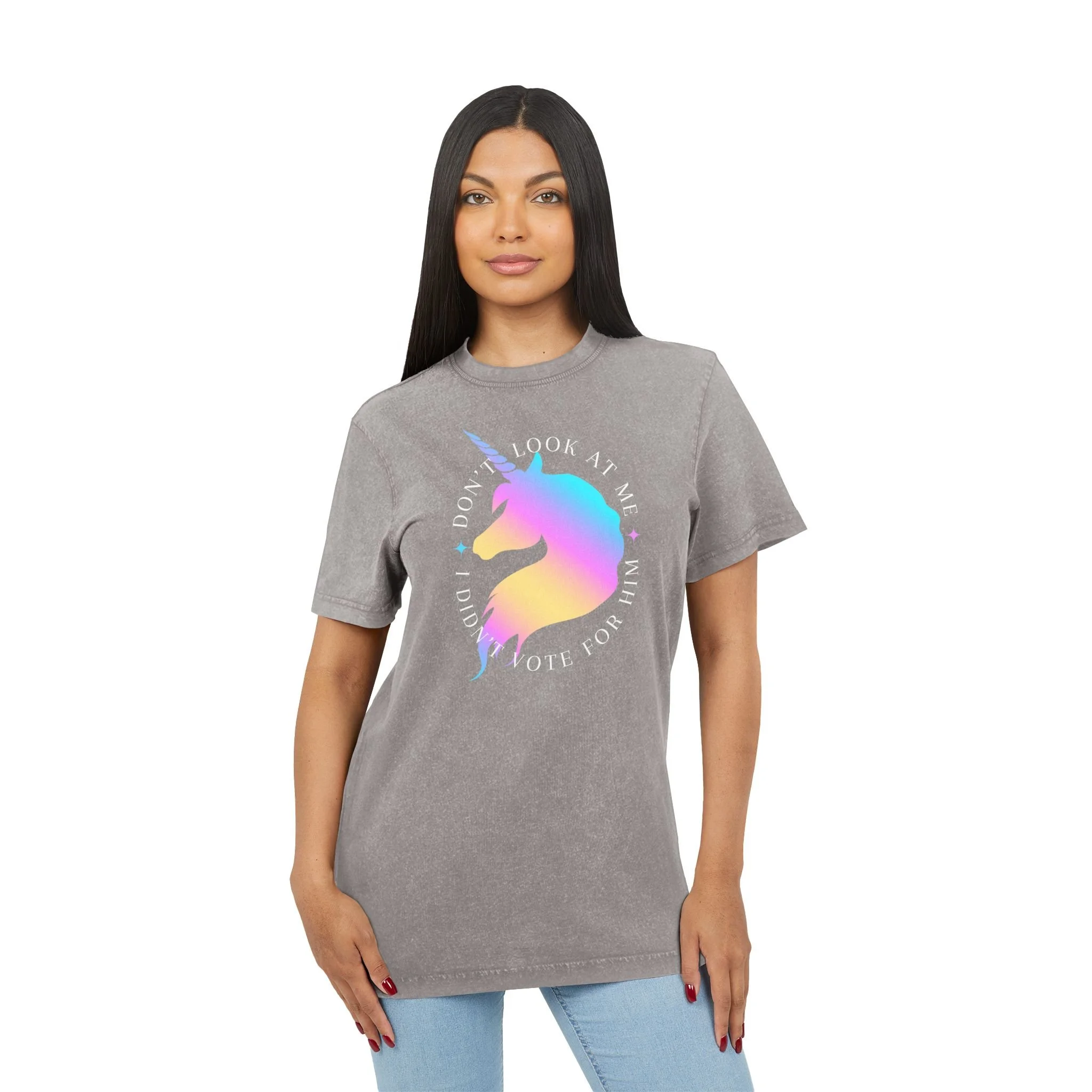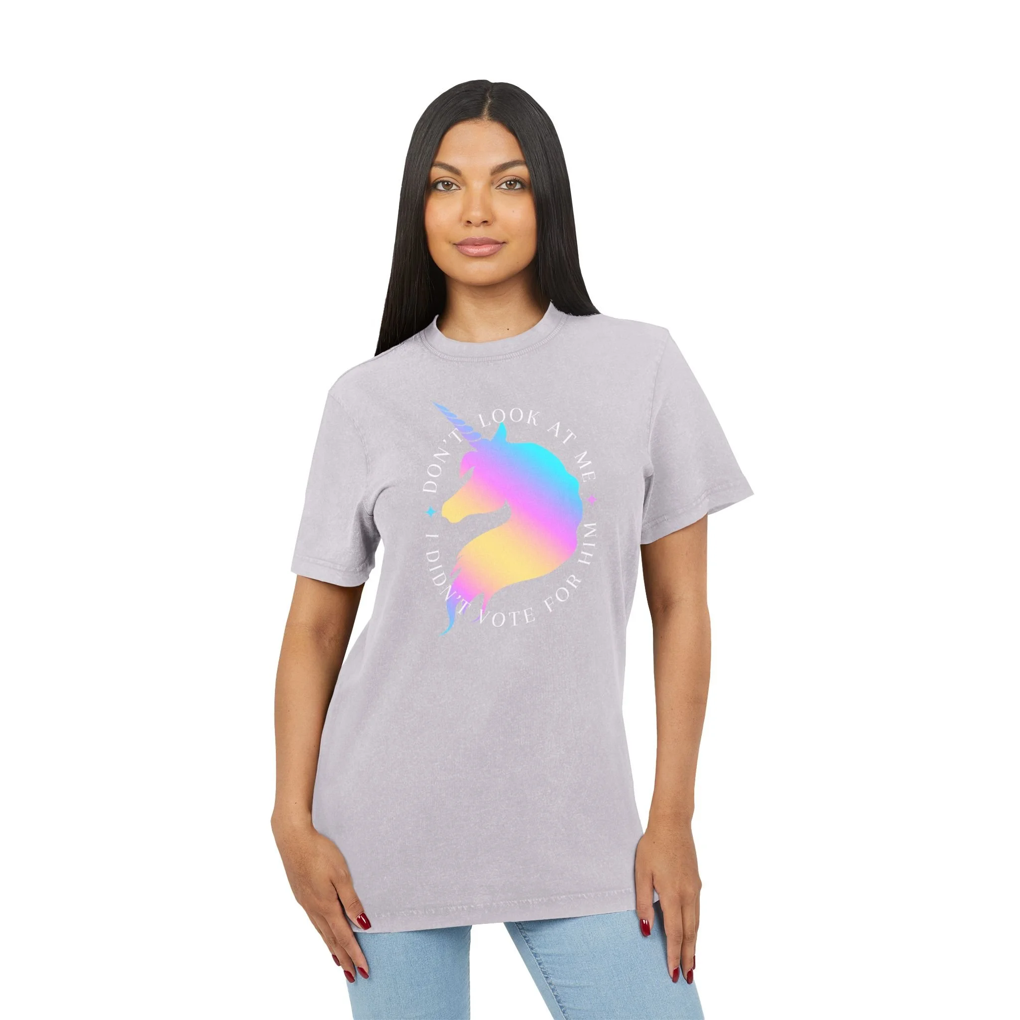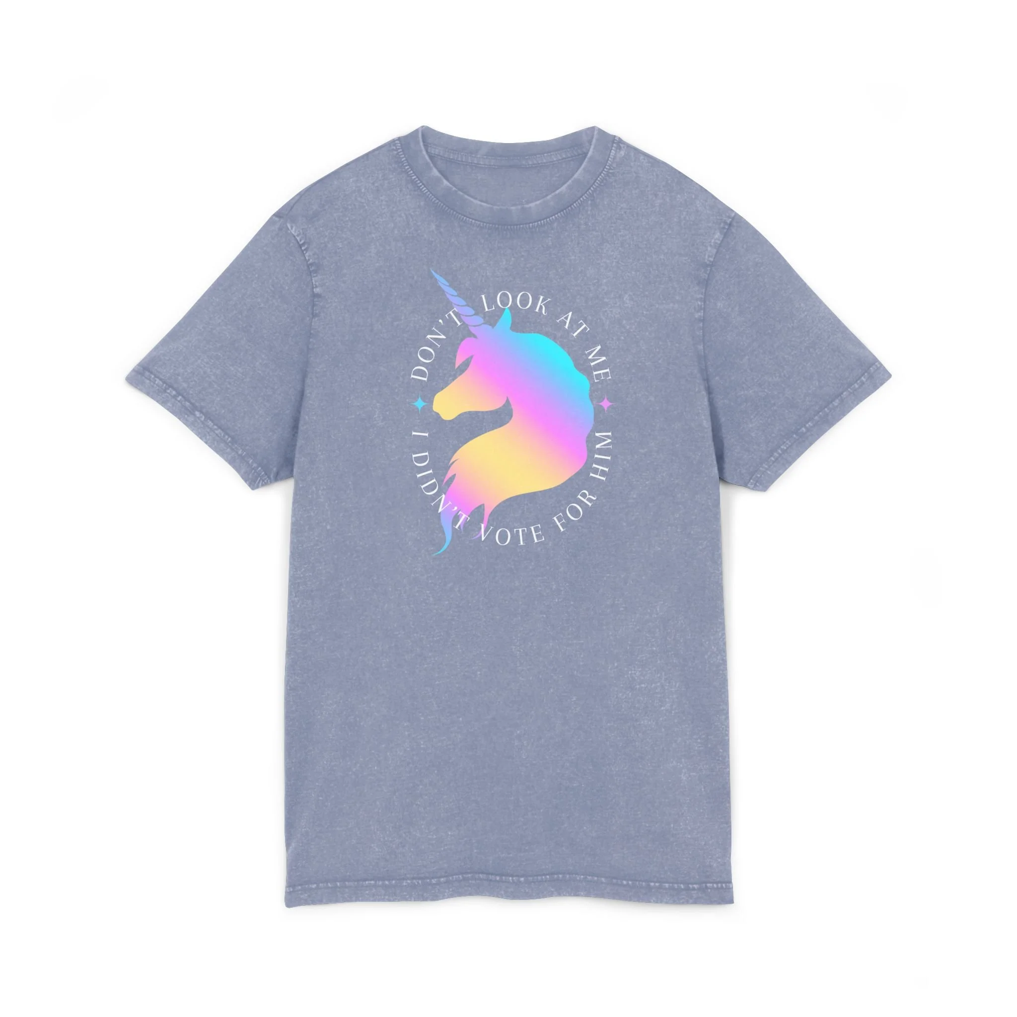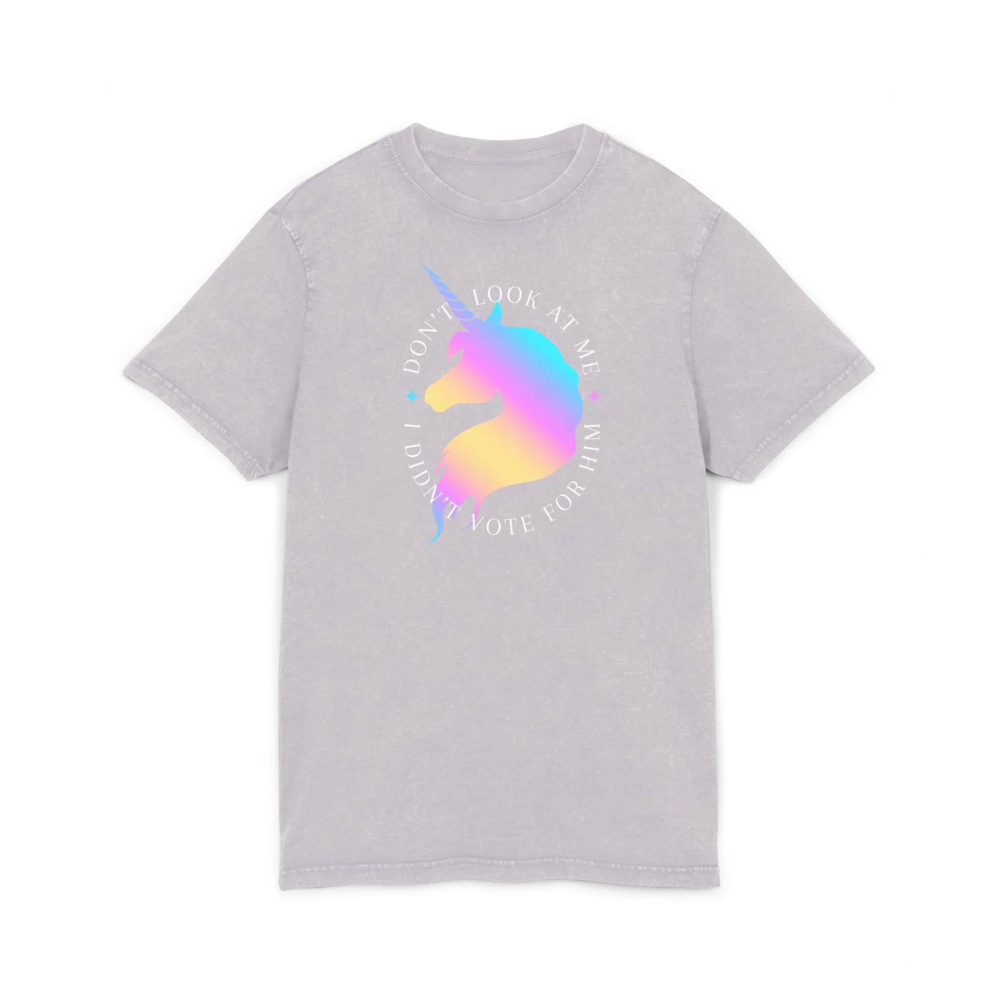Make your stance loud and magical with this bold statement tee. Featuring a radiant unicorn and the cheeky phrase "Don't Look at Me, I Didn't Vote for Him," this shirt blends sass, humor, and a touch of fantasy. Printed on a vintage black unisex tee, it’s perfect for protests, coffee runs, or just letting the world know where you stand—sparkles and all.