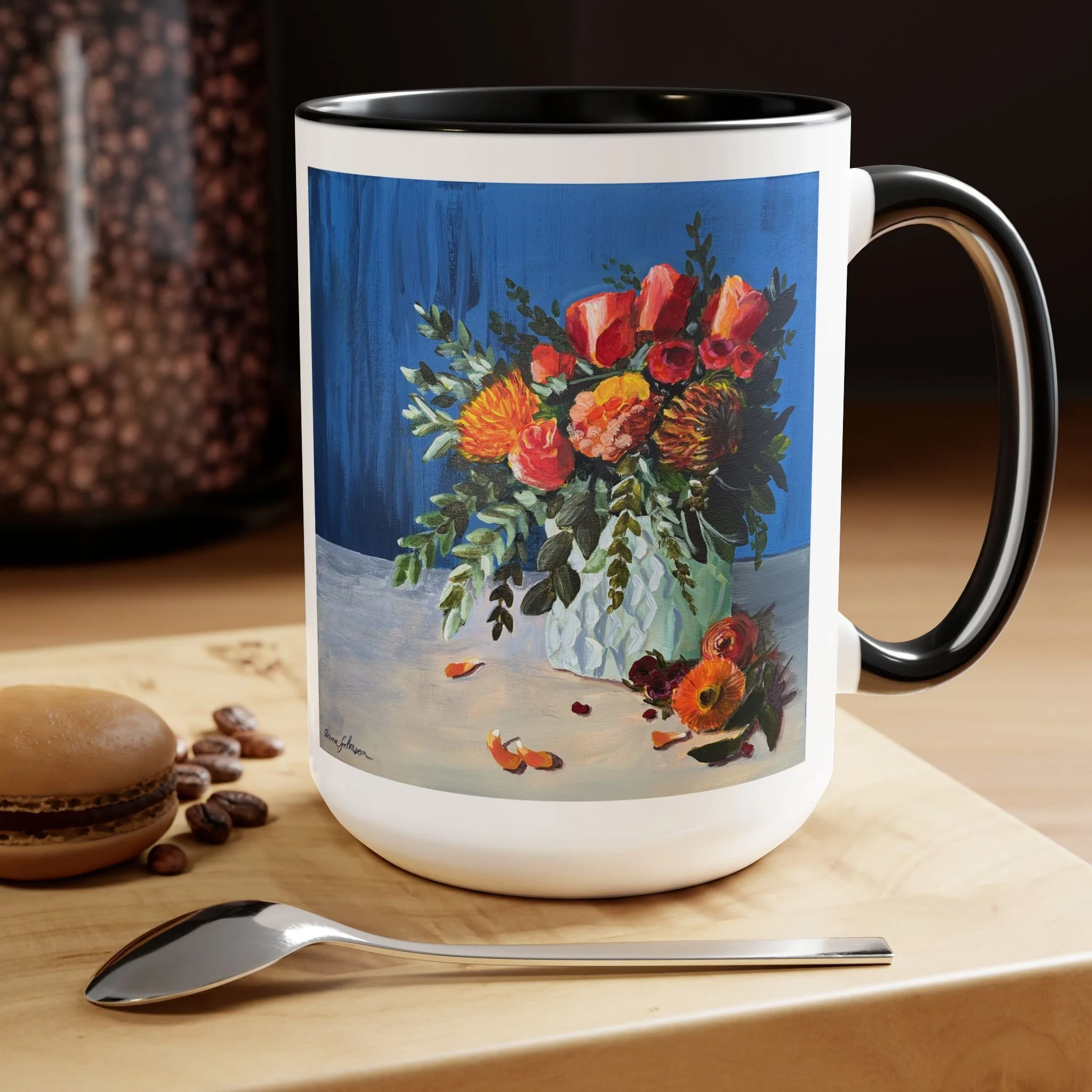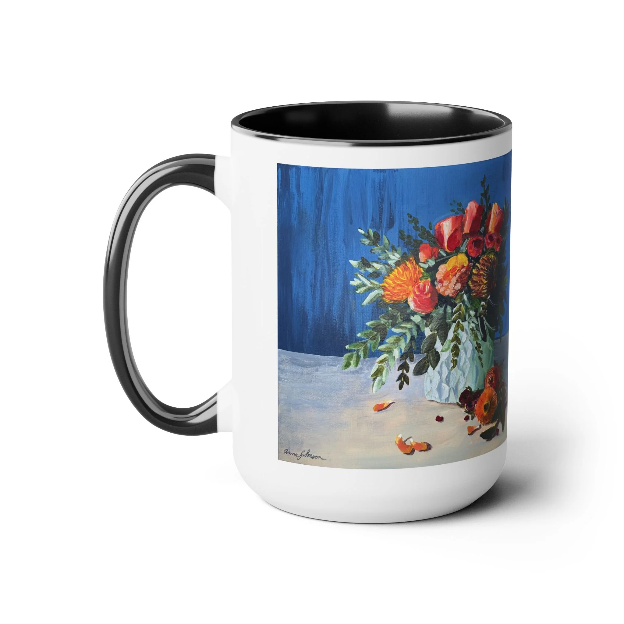 This floral painting coffee mug helps to start the day just right. Each mug comes with a black handle and interior with a glossy finish. Material: 100% ceramic. One size: 15oz (0.44 l). Lead and BPA-free.