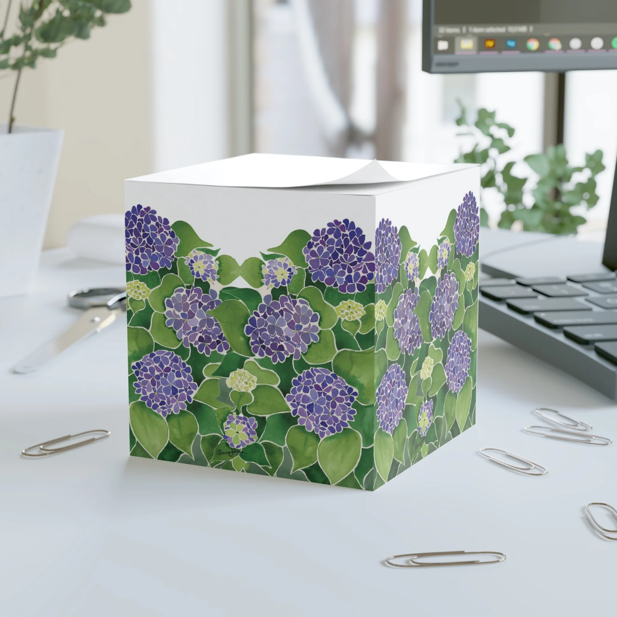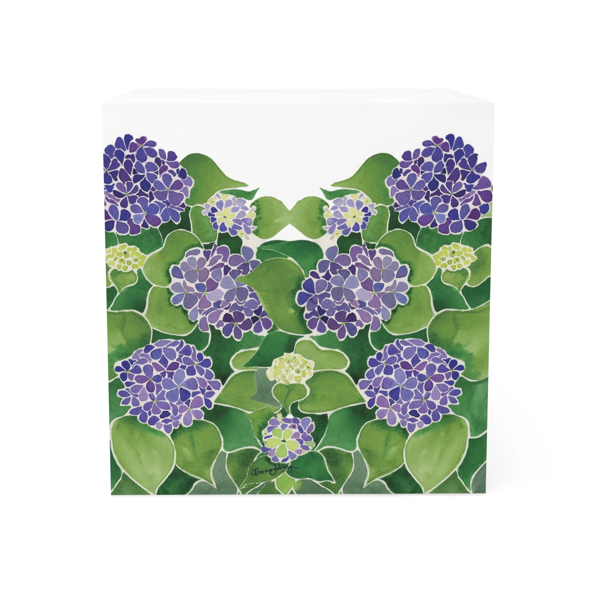 This sticky note cube features 700 individual sheets with a light adhesive strip on the back. Around the edges are colorful Hydrangeas. It looks right at home on any desk or office space. Each cube measures 3.37" (W) by 3.5" (H). Print colors may appear darker due to the print method. Assembled in the USA from globally sourced parts.