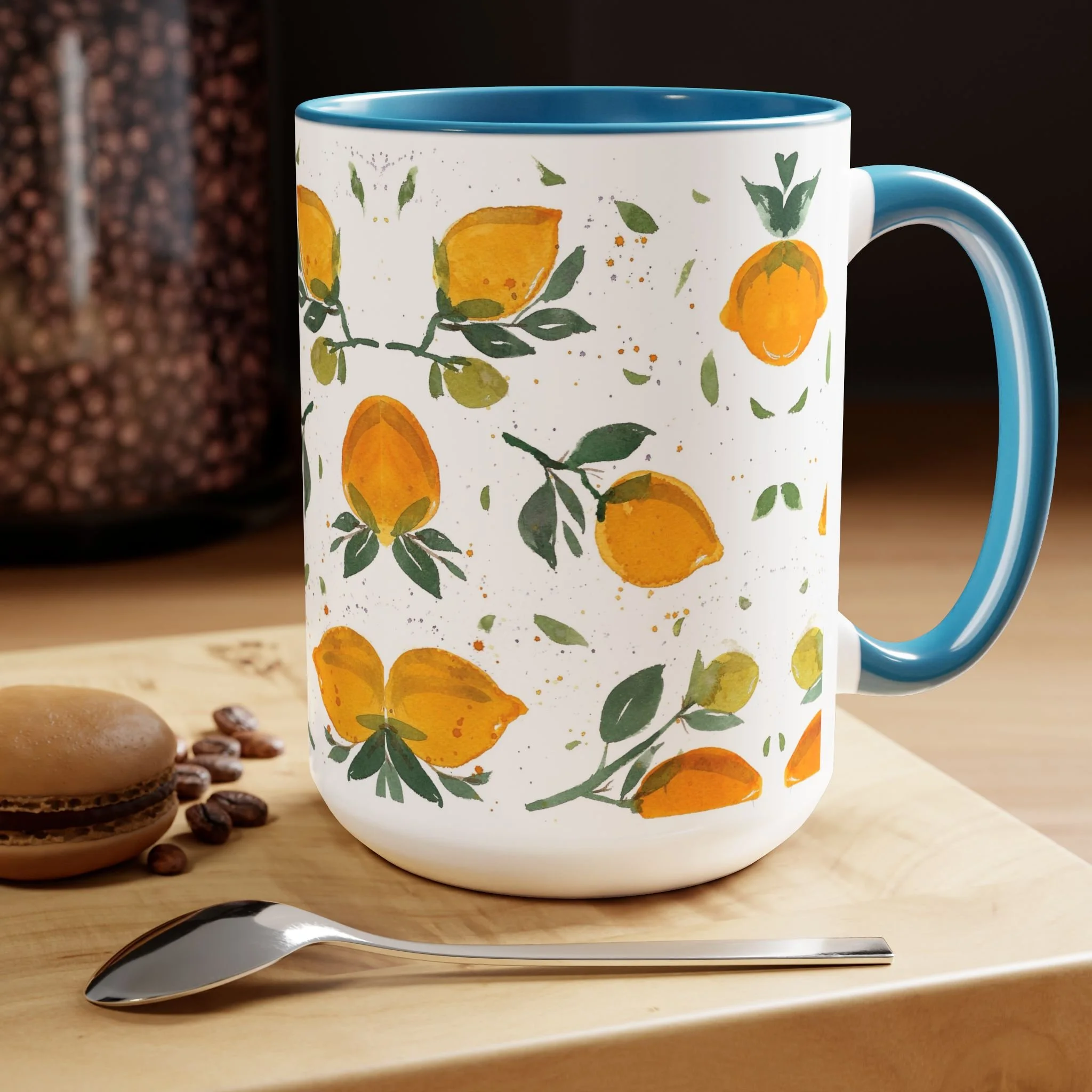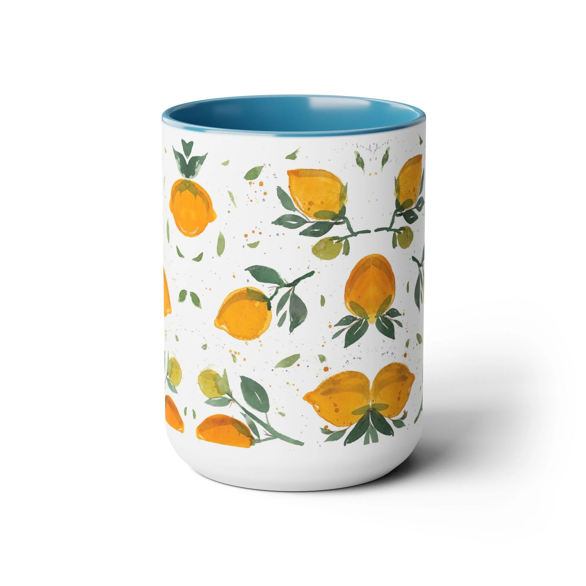This Lemon coffee mug helps to start the day just right. Each mug comes with a light blue handle and interior with a glossy finish. Material: 100% ceramic. One size: 15oz (0.44 l). Lead and BPA-free.