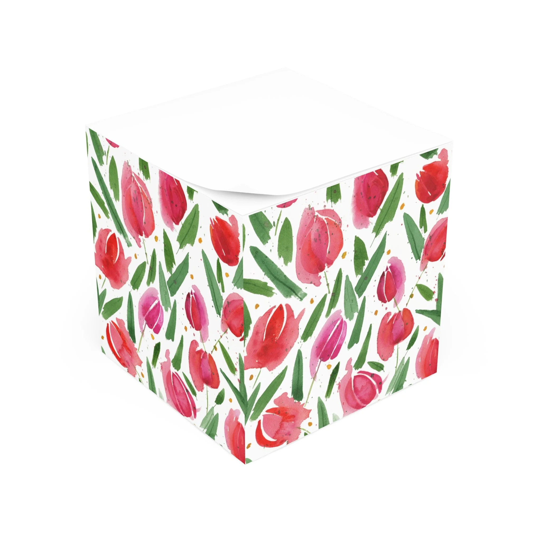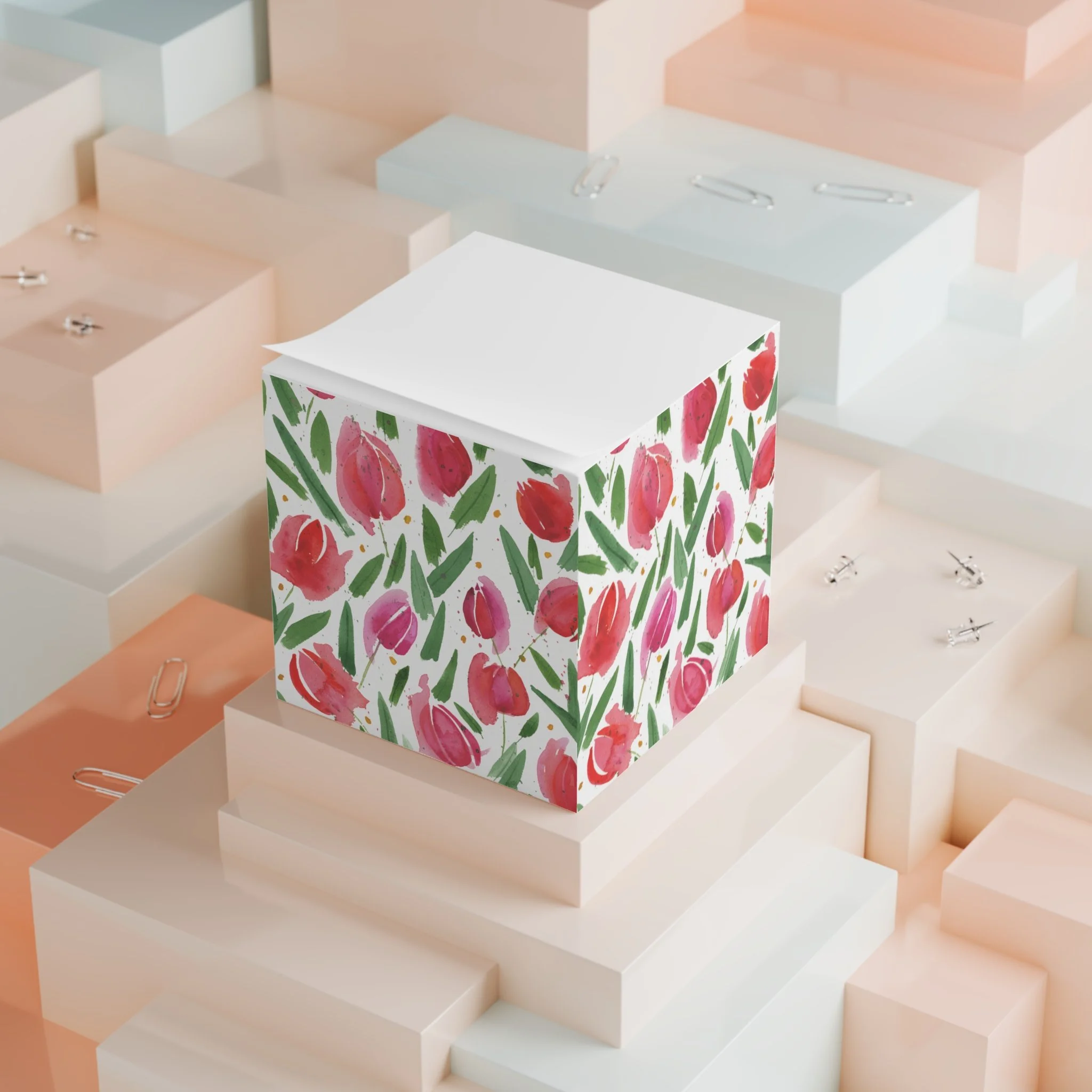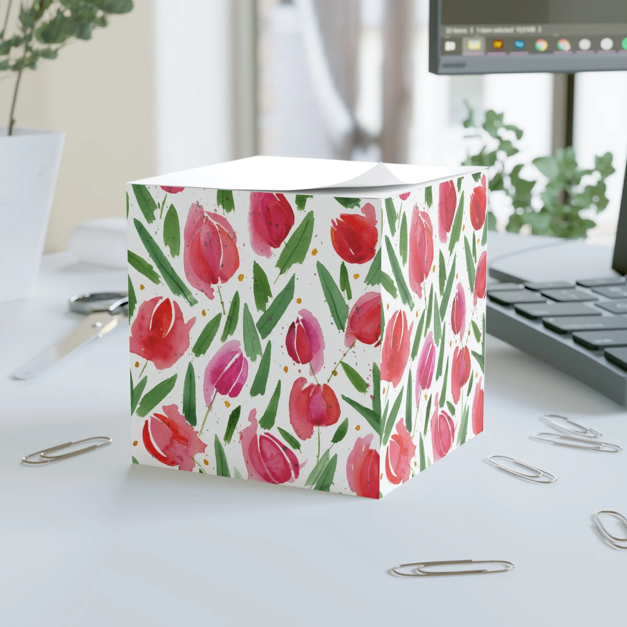 This sticky note cube features 700 individual sheets with a light adhesive strip on the back. Around the edges is printed with colorful Pink Tulips. It looks right at home on any desk or office space. Each cube measures 3.37" (W) by 3.5" (H). Print colors may appear darker due to the print method. Assembled in the USA from globally sourced parts.