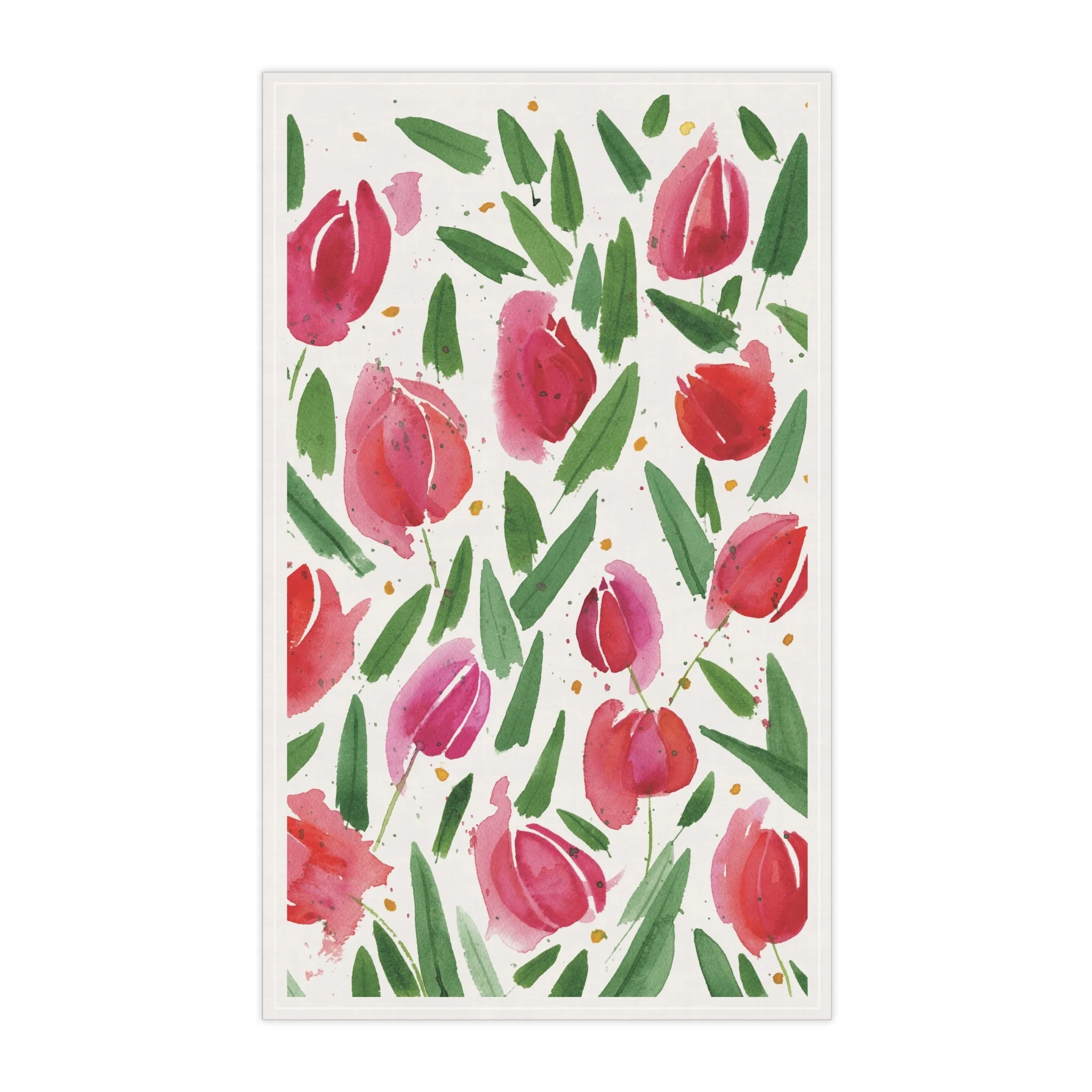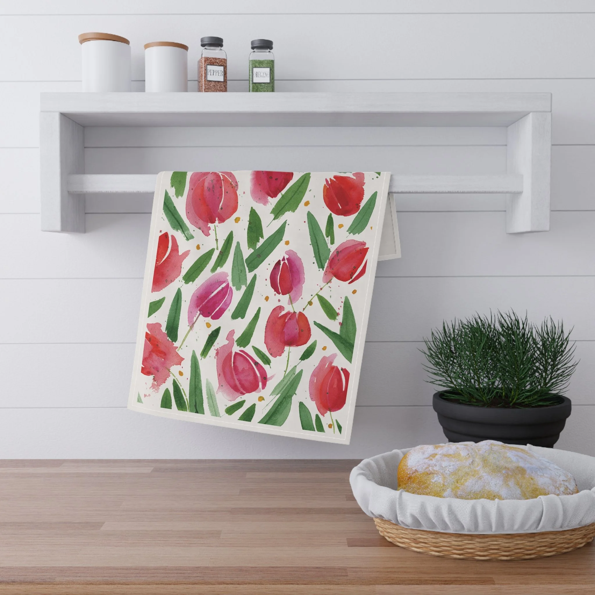 Bring the beauty of pink tulips into your kitchen with these vibrant and durable tea towels. Ideal for those who appreciate watercolor art and want to elevate their kitchen decor. Great for gifting on birthdays, Mother's Day, or housewarming parties. Hemmed edges for durability. Vibrant colors with crisp prints. 100% cotton twill options. Available in one size: 18" × 30". Care instructions, machine wash: cold (max 30C or 90F), gentle cycle, mild detergent. Do not bleach. Tumble dry: low heat